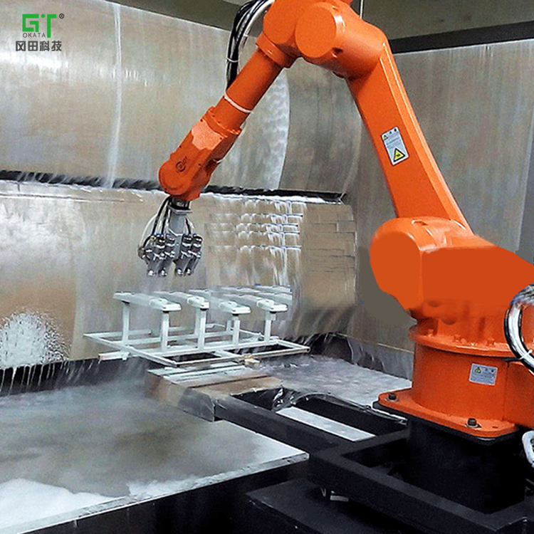 機械手噴釉屬于自動噴釉,其全套設備主要包括坯體傳送聯動線、可控制轉動角度的承坯臺、噴